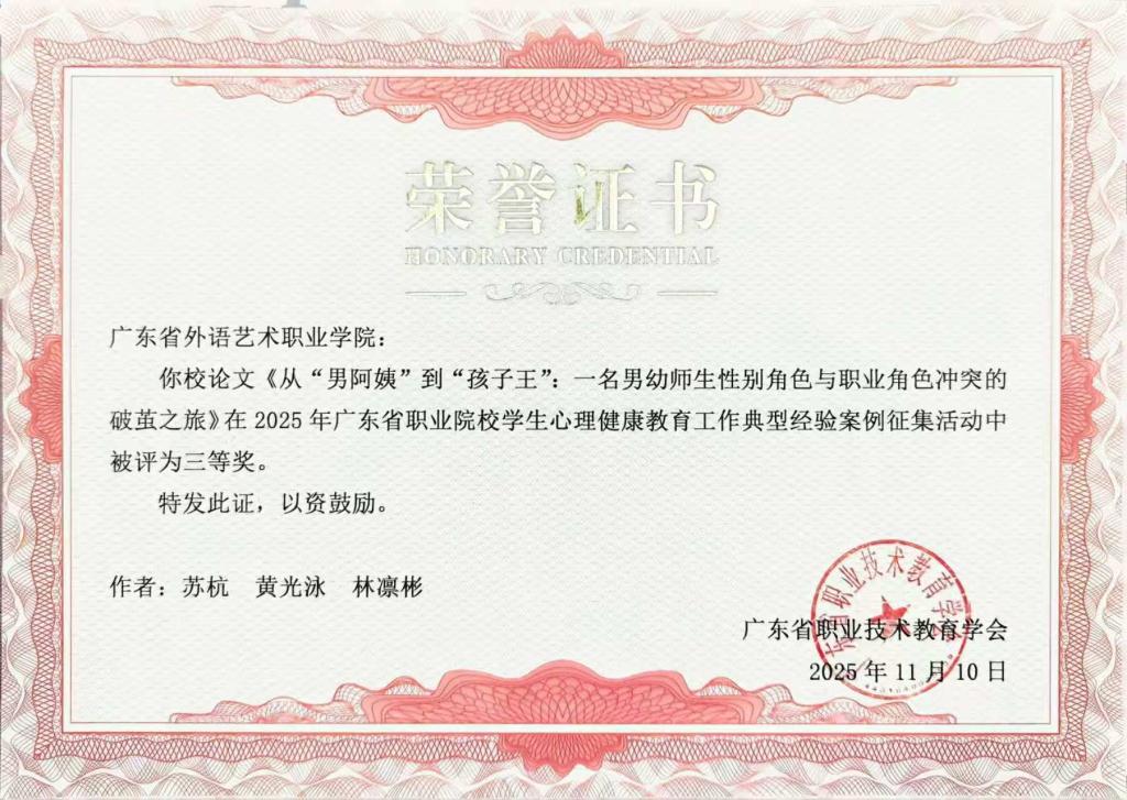 会议颁发了职业院校学生心理健康教育工作典型经验案例征集活动的获奖名单。我校民政服务与管理学院刘婉娜、邹磊磊、何理文案例《观影疗心:电影疗法在学生第二课堂活动中的应用与探索》获二等奖,学前教育学院苏杭、黄光泳、林凛彬案例《从“男阿姨”到“孩子王”:一名男幼师生性别角色与职业角色冲突的破茧之旅》获三等奖。